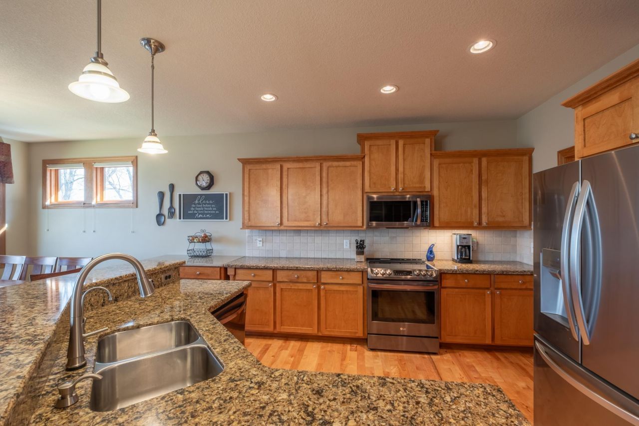 Located less than 2 miles from historic downtown Northfield, this extremely well built 4 bedroom, 4 bath ranch style home is loaded with quality features and high end amenities. The main level primary suite is on the east side of the home, and the 2nd bedroom in on the west side side of the home. The primaty suite has a walk in shower, a jetted tub, 2 sinks, tile floors, and a walk in closet. The kitchen features custom made Birch cabinetry, Cambria quartz countertops, high end appliances, and a nice breakfast bar. The floors are #2 maple, the office and foyer both have french doors, there's a built in surround sound system, the tray vaulted ceiling in the living room has recessed lighting, and the gas fireplace has a beautiful stone surround. The walk out lower level is a perfect space for entertaining friends or enjoying time with family. There are two bedrooms in the lower level, and 1 of the bedrooms is a 2nd primary suite complete with a jetted tub and a shower. There's also a nice bar area and a 4th bathroom. The entire cement slab has in floor radiant heat, the lower level ceilings are 9' high, there's a whole home water filtration system with Ion exchange softener, and there's a 2nd gas fireplace that also has a beautiful stone surround. The double hung wood windows are best that Marvin makes, there's an in-ground sprinkler system, heated garage, 3 ton A/C, 3 panel birch doors, over sized millwork, large deck with Trex decking, a stamped & colored concrete patio, leaf filter gutter shield, and the home was built with floor trusses! I've been doing this for a long time, and I haven't been in many homes that feature such a perfect floor plan that's so well built. This is a very nice rambler that's in a great area of town!