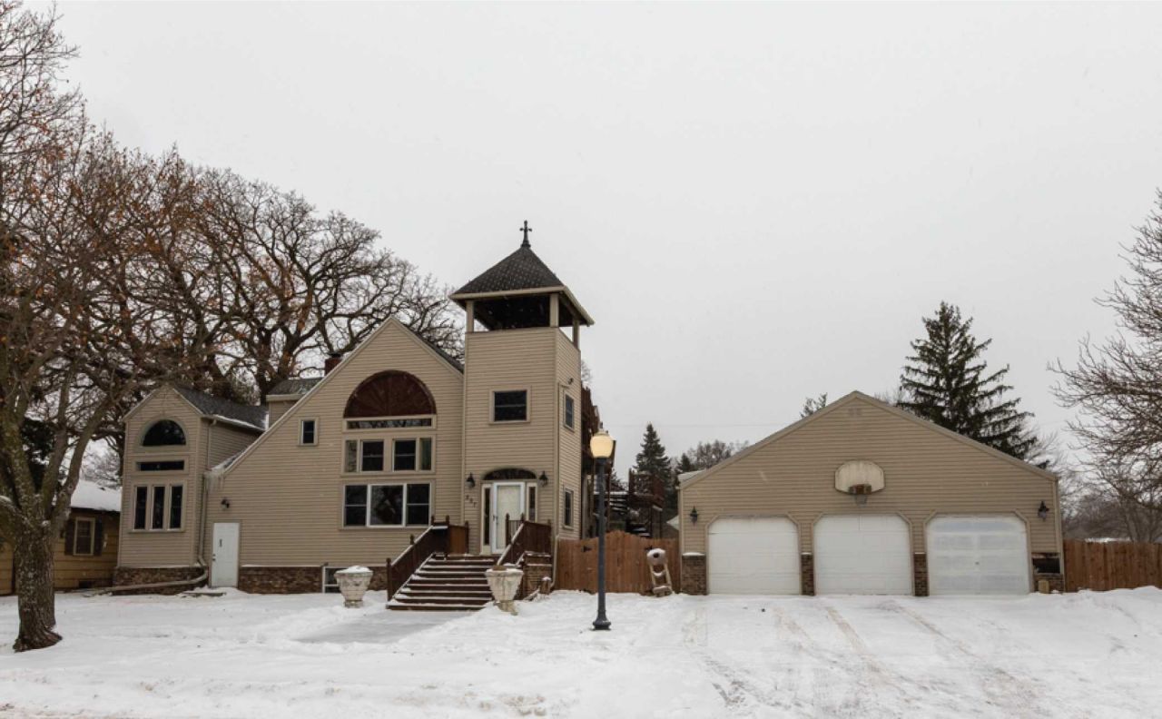One-of-a-kind 6BR/3BA historic residence with 2-stall garage, rich architectural character, and flexible living spaces. Formerly theChurch of God, with records traced to 1924 via the Blue Earth County Historical Society. The original church foundation was reused, with a country church from Judson, MN rebuilt on site in 1945. The church remained in use until 1986, when purchased by the current owner, a commercial construction carpenter who thoughtfully transformed the property. The former church altar remains in the living room as a striking focal point. Open-concept main level with kitchen featuring generous pantry space, original white hanging light fixtures from the church, spiral staircase, 2 main-floor bedrooms, and full bath with hot tub, heated floors, and laundry. The entire second floor was built during renovation, offering 2 bedrooms, full bath, balcony, stained glass from another church, and 2 leaded-glass windows from Colorado. Navy-blue room is a legal bedroom. Lower level has separate entrance, living area, kitchen, bath, and bedrooms; previously used as pastoral residence and later church spaces. Don't forget to check out the 3rd story deck overlooking the city/valley. Active rental license through 12-31-2026. Historic details include driveway lights from the City of Mankato, exterior lights from the original YMCA and aged green metal elements salvaged from the former First National Bank roofline. Cobblestone drive, fenced yard, flower beds, patio. Across street Roosevelt School, near parks, shopping, grocery, and worship. Quick close possible. in the late 1800's to 1900's Ringling Brother circus tied their elephants to a tree that was in this back yard- lot- farmland. The circus probably kept other livestock here as well. Data from Mankato Historical Society also provided. Circus stories from neighbors-community members.