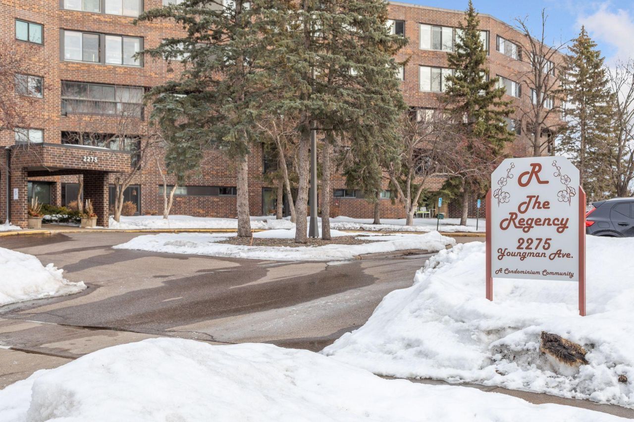 THE REGENCY in SHEPARD PARK! CORNER UNIT - PRIVATE BALCONY WITH FANTASTIC PANORAMIC VIEWS of the Mississippi River basin and Crosby Regional Park. Discover this warm and welcoming SE facing corner unit with a beautiful wall of windows, 9ft ceilings, generous floor plan, and glass enclosed sun porch. You will love the bright and airy living room with scenic views of the treetops, charming eat-in kitchen with pass thru to the separate formal dining room, and a full size laundry room. Enjoy a private owners suite with 3/4 bath with walk-in closet, a versatile den - also with a walk-in closet - could be converted to a second bedroom - or excellent family/hobby room. The sun filled porch captures the beauty of the outdoors and is a wonderful extension of living space during the summer months - leave the doors open for a lovely breeze and its large enough for patio furniture and table to dine al fresco! All living facilities on one level, excellent closet/storage, no interior stairs - elevator to garage. Secure, well maintained brick building & grounds with on-site staff, outdoor green space, clean common areas with fantastic on-site amenities: two community/party rooms, fitness center with sauna and steam room, outdoor heated pool, sun deck and easy visitor parking. Unit includes one underground heated parking stall (angled for easy entry) with a walk-in storage unit directly in front, and its own EV charger with separate meter. Ultra convenient location to West 7th and downtown St. Paul, trendy eats/shops, quick access to airport, MOA, and Mississippi River parks/trails - Regional Trail across the street, bus & more! Assn includes heat, cable, water/sewer. New building roof 2025.
