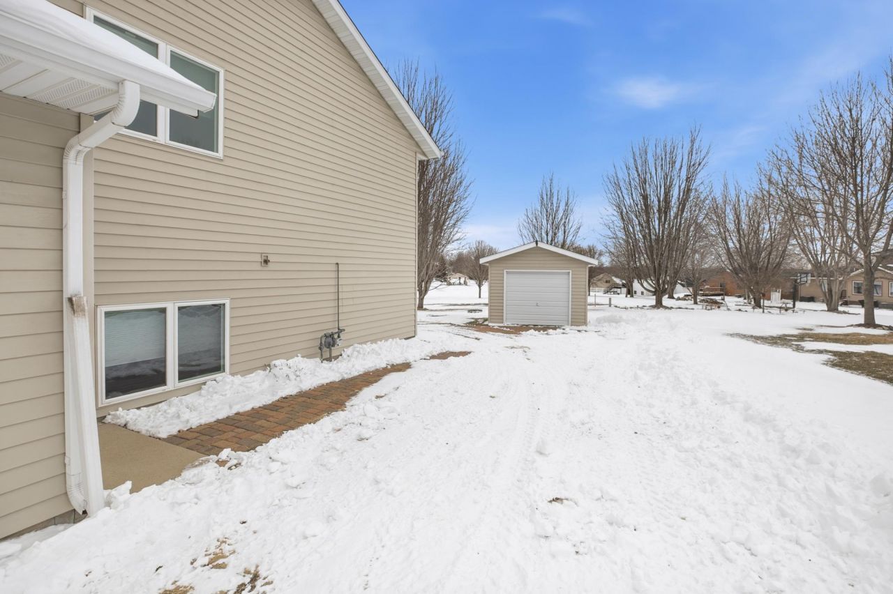 From the moment you arrive, this home presents a warm and well-cared-for first impression. The exterior blends durable vinyl siding with a classic brick accent, complemented by seamless rain gutters and a newer roof installed in July 2023. A thoughtfully designed paver stone sidewalk leads you to the back yard, while a matching paver platform creates a welcoming space near the storage shed. Solar-powered security lighting on the front of the home as well as the storage shed, and a concrete driveway leads to the finished garage, complete with insulated walls and doors, built-in shelving, a heater, and even a 220 outlet for hobbies or projects.Step inside to a tiled foyer where function meets style, highlighted by a recently added built-in bench and open locker system. As you move upstairs, the home opens into a bright and inviting living space with vaulted ceilings that seamlessly connect the kitchen, dining, and living areas. The kitchen is both stylish and practical, featuring custom cathedral-style raised oak cabinetry with hidden hinges, updated countertops, stainless steel appliances, a new backsplash, and refreshed flooring and lighting. A ceiling fan in the dining area adds comfort, while a large dual-pane glass door to the deck fills the space with natural light.Just off the dining area, step onto the maintenance-free composite deck, recently updated, where you can relax and take in peaceful views of the park directly behind the home. The backyard setting is truly special, with no rear neighbors, just open and inviting space to enjoy. Below, an exposed aggregate concrete patio offers an additional outdoor retreat, perfect for entertaining or unwinding in the shade.Upstairs, the primary bedroom features a ceiling fan and mirrored bifold doors, with convenient access to the full bathroom through a walk-through design. A second bedroom and ample hallway storage, including a linen closet, complete the upper level. The lower level offers even more living space, anchored by a spacious family room with a gas fireplace controlled by its own thermostat, an ideal supplemental heat source. A third and fourth bedroom, additional bathroom with built-in linen storage, and extra storage areas provide flexibility and comfort for guests or everyday living.This home has been meticulously maintained, with updates including newer windows, furnace and air conditioning, gas water heater, and freshly cleaned carpeting upstairs. Practical features like a programmable thermostat, owned water softener, and whole-house water filter add to the home's efficiency and ease of living.Beyond the property itself, the location is just as impressive. With a 2.3 acre city park directly behind the home, you'll enjoy a sense of openness and connection to nature. The nearby Albany Golf Course is just a block away, complete with a convenient golf cart path for easy access. Outdoor enthusiasts will also appreciate being just a couple of blocks from the Wobegon Trail, offering